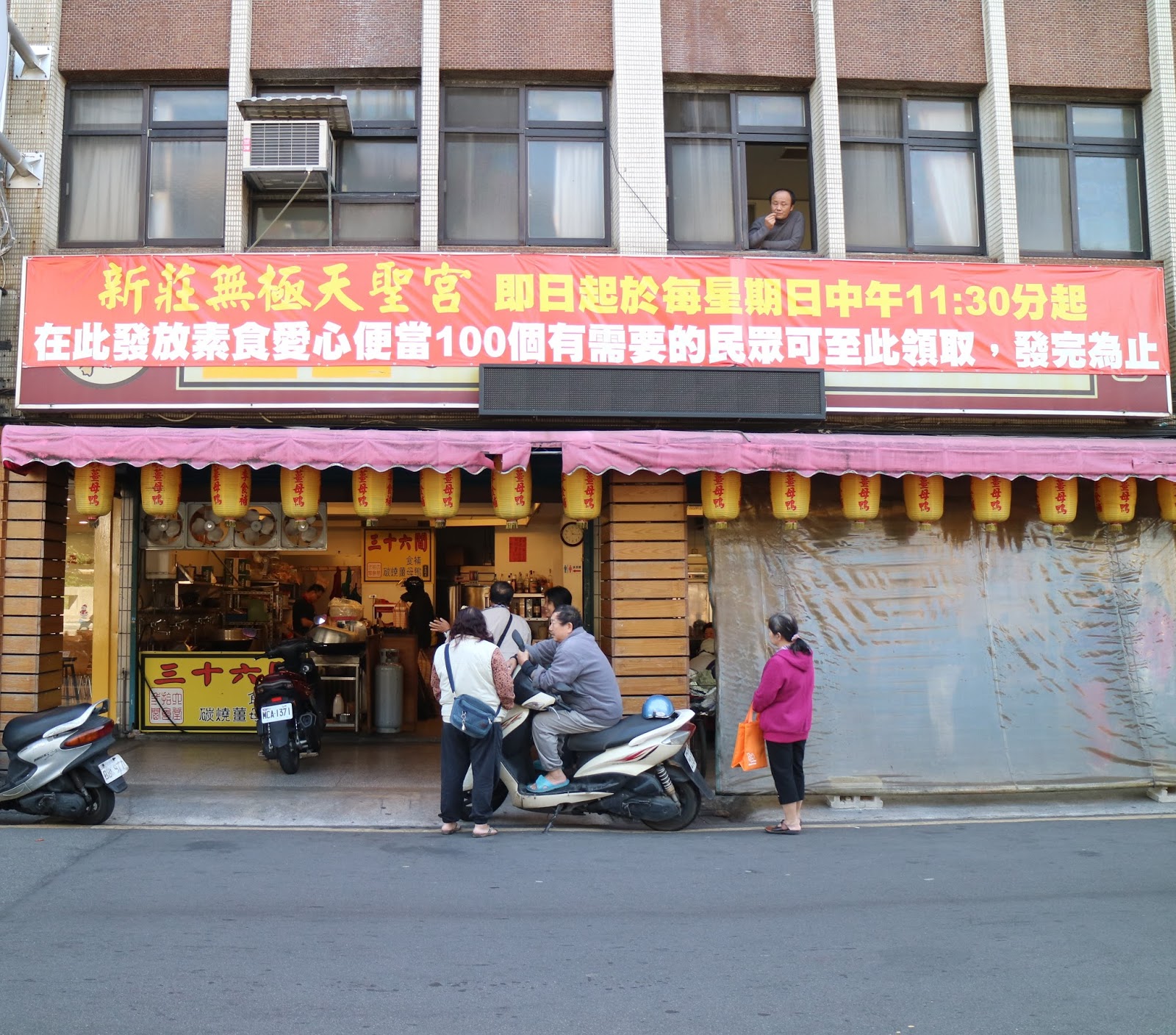 【記者高昱晴報導】新莊無極天聖宮在今年重陽節開始發放素食愛心便當,每逢周日中午就會免費發放一百個,有需要的民眾可至公園路十四號「三十六間碳燒薑母鴨」門口排隊領取。