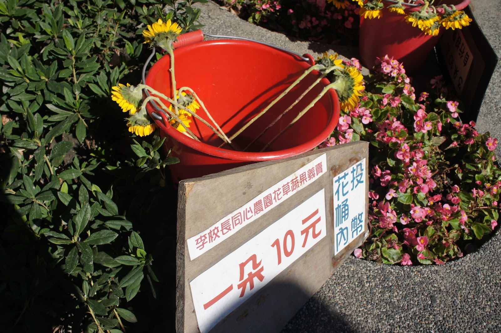 【記者張瀞月報導】捷運新莊站前放置著幾個水桶,裡面插滿了新鮮花朵,旁邊有一個立牌寫著「一朵十元,投幣花桶內」。這是退休校長李文侯和家人成立的北大同心園花草義賣,所得全數捐給公益基金會。