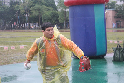 ▲總監潘俊明投出閃電盲人棒球隊回贈的全體球員簽名球,為一天活動揭開序幕。