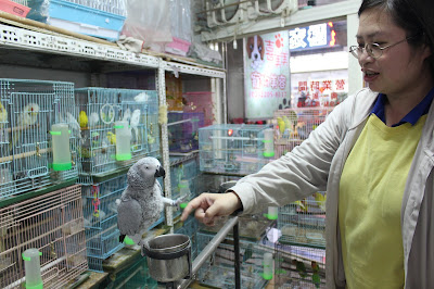 ▲禽流感防疫首要原則,避免寵物鳥與野鳥接觸。圖為咕咕鳥寵物飼料店顧客逗玩店內的灰鸚鵡。