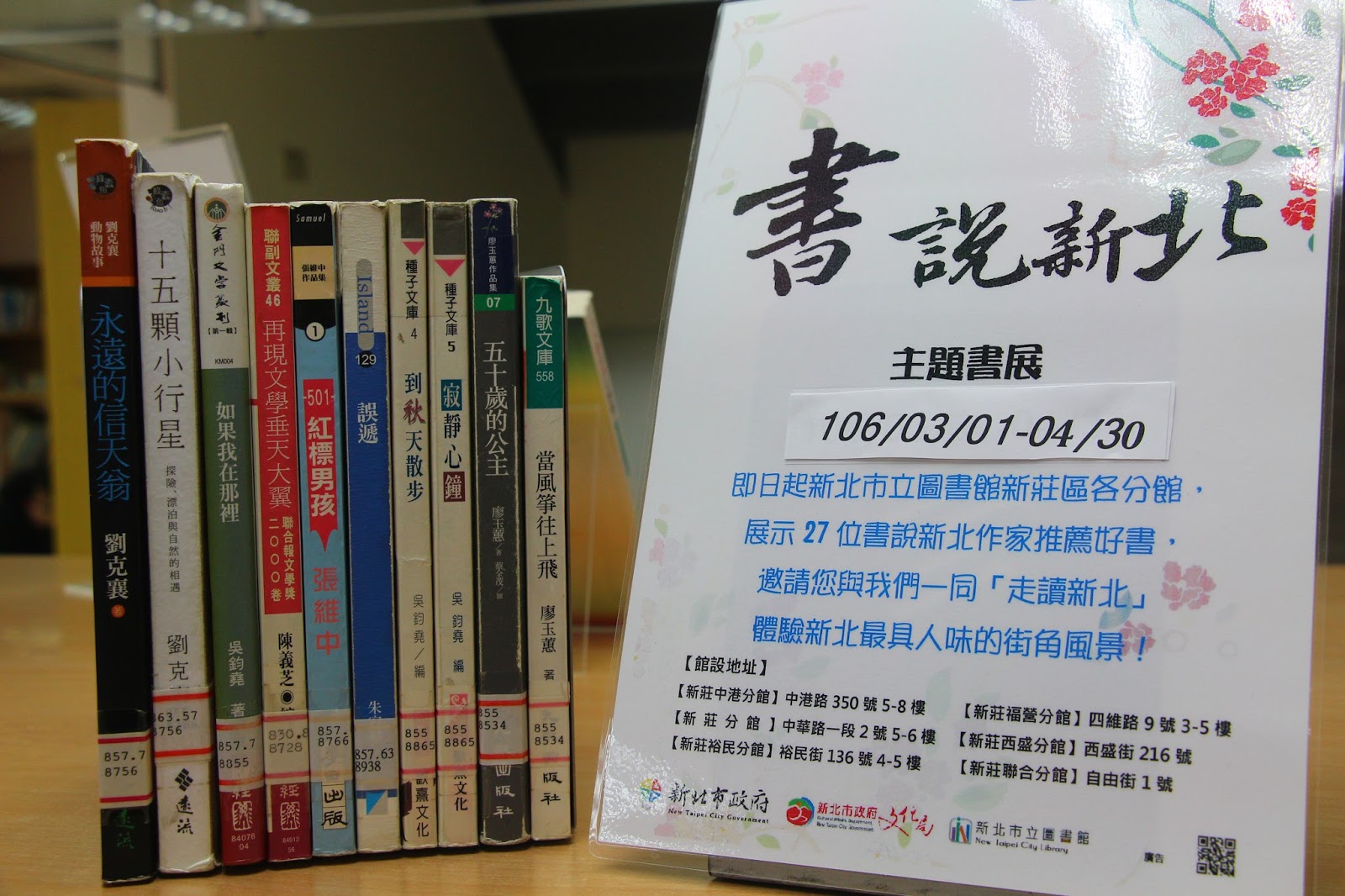 【記者吳一茗報導】新北市立圖書館新莊各分館配合新北讀書節,舉辦「書說新北」主題書展,展示廿七位作家的推薦好書,展期至四月卅日。