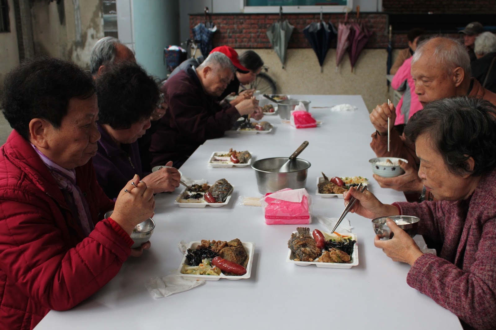 即使陰雨連綿,仍然不減熱情,前來用餐的里民約七十人,有的在唱卡拉OK,有的早已坐定位並與一同用餐的里民聊天。一旁的義工媽媽正忙著準備午餐,她們一早就到活動中心準備。擔任共餐主廚的顏麗玉說:「因為我之前有在自助餐和工廠當過廚娘,就被拜託來負責煮菜,沒想到一煮就煮了四、五年。」