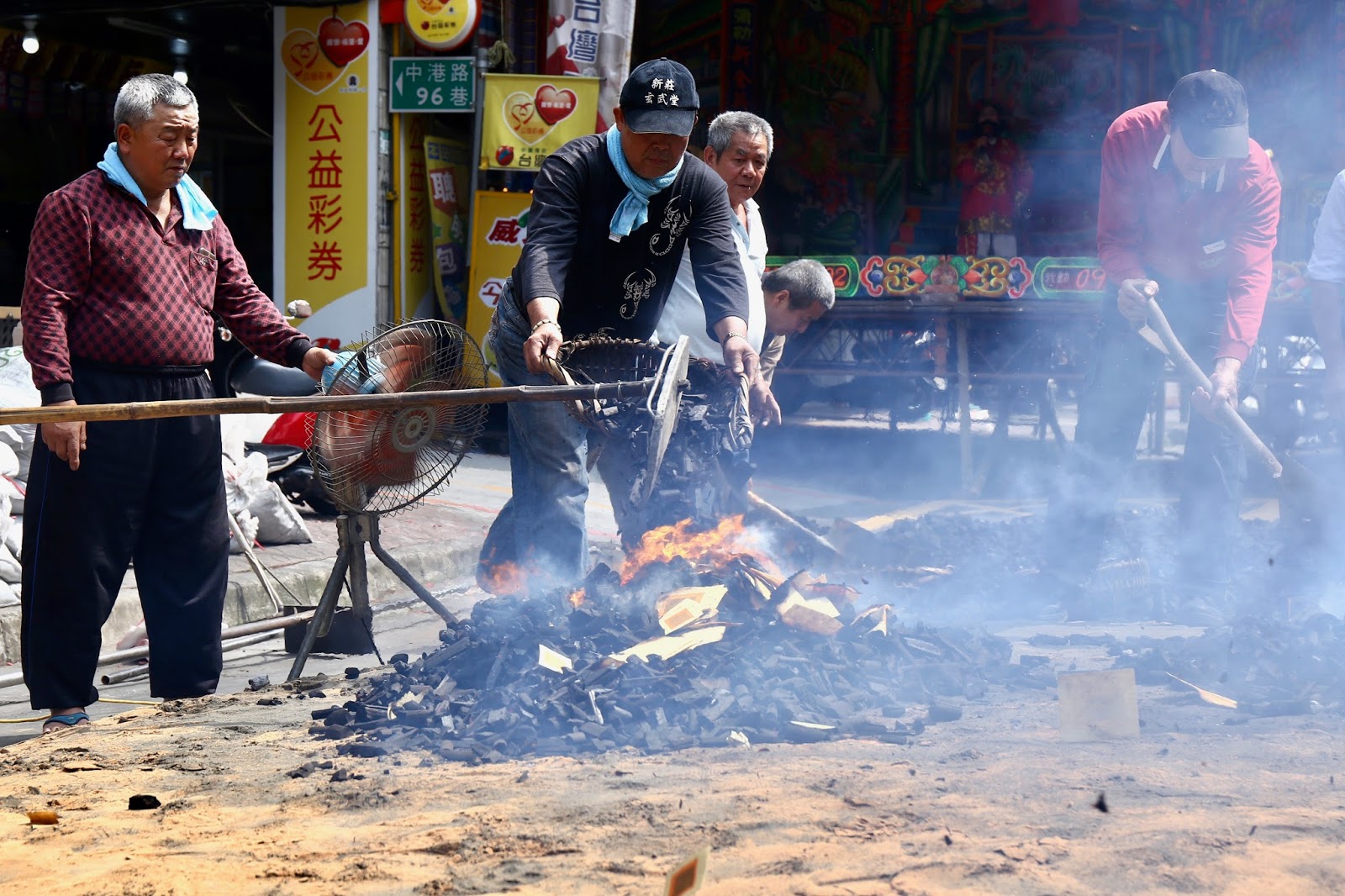 恆安里福德祠三月卅日下午舉行過火儀式,參與人員必須赤腳走過木炭堆。與其他廟宇不一樣,福德祠使用木炭燃燒金紙,並且等待其自然冷卻,沒有使用竹竿或是鹽米降溫。圖為工作人員使用大量木炭燃燒金紙,製作過火儀式的木炭堆。