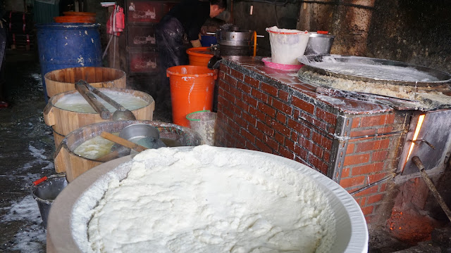 ▲尤協豐店內所有工具都十分質樸、傳統。左側幾個大桶用於過濾豆渣和製作豆花,右後方