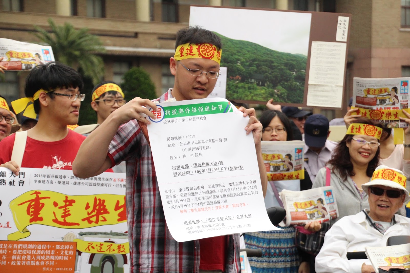 【記者陳婕翎報導】樂生反迫遷大遊行十週年,樂生保留自救會、青年樂生聯盟與近五十個「樂生重建元年」共同發起團體,四月十五日上午十時卅分集結在行政院前,將社會大眾共同買下的頭版廣告,以「掛號信」方式將報紙送入行政院,盼行政院院長林全盡速定案「大平台方案」,重建樂生。他們也邀請林全出席四月廿九日的凱道大遊行。