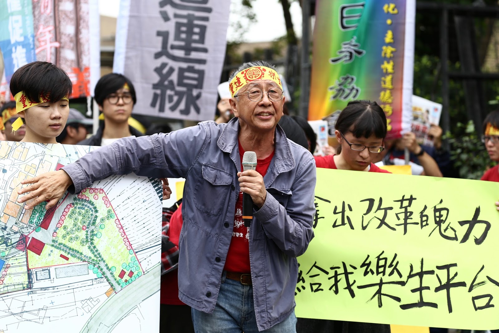 ▲「大平台方案」設計者、臺大城鄉所前教授劉可強向現場參與者與媒體說明大平台方案。