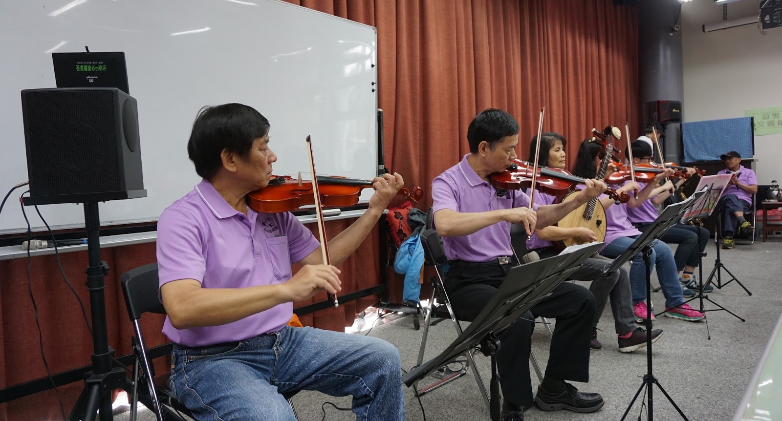 ▲廖天賜(左一)帶領愛之鄉樂團的成員們正在為弘道老人福利基金會的老人們義演。