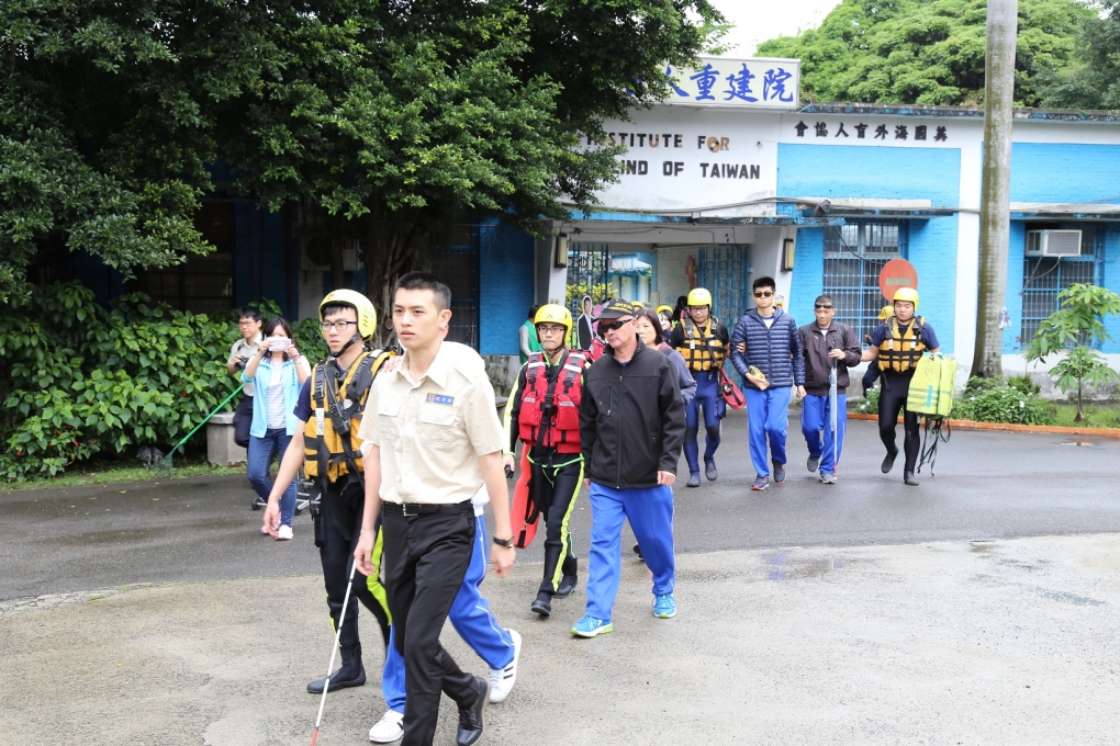 ▲新莊區公所四月廿七日舉辦無腳本防災演練,圖為消防局協助盲人重建院視障人士演練水災逃生。
