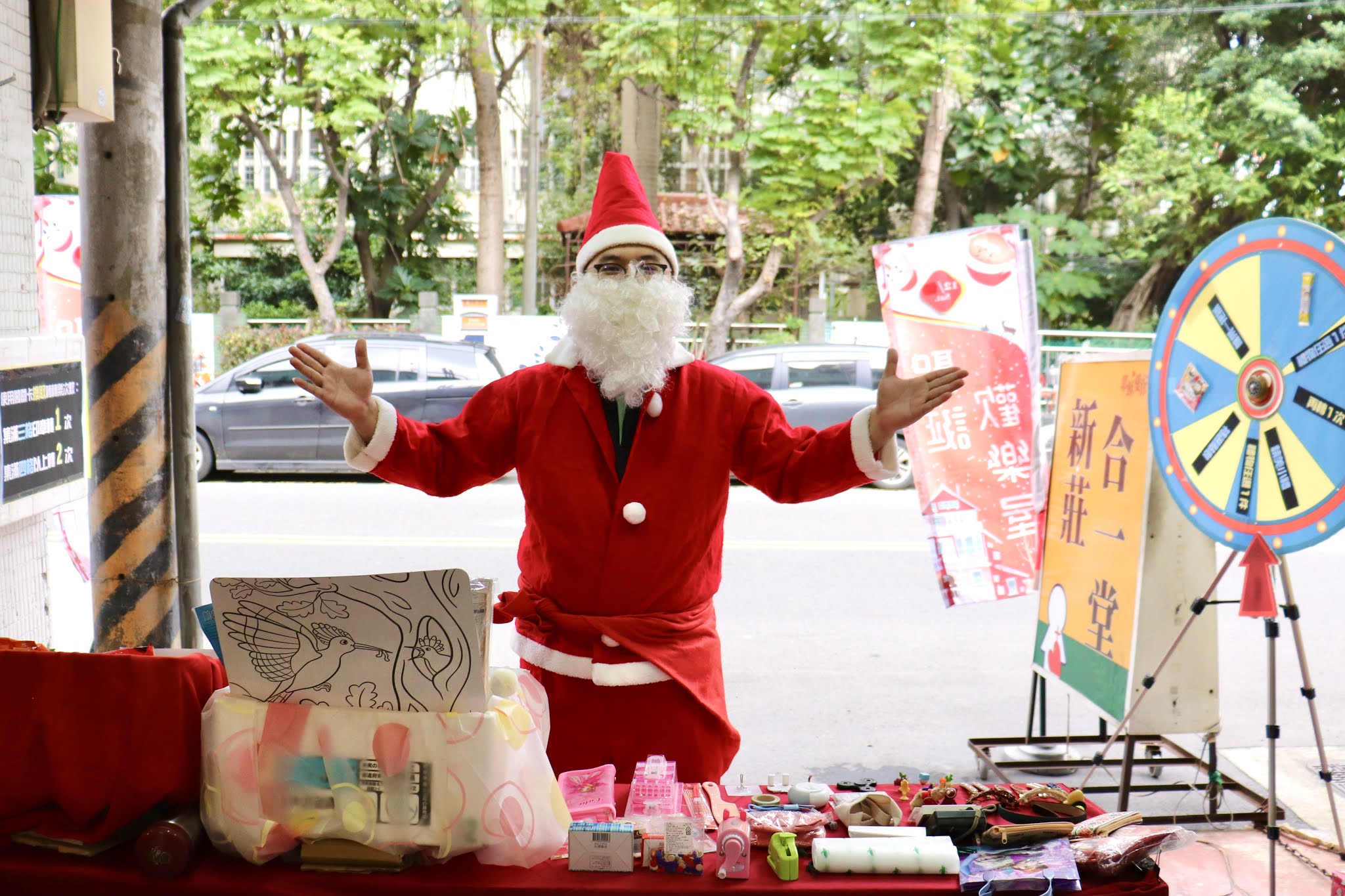 新莊合一堂志工扮成聖誕老公公,帶給民眾歡樂。