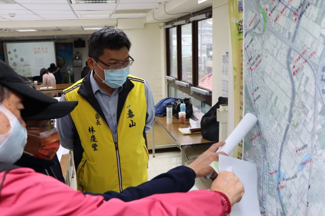 | 區長和里民正討論重劃前的地圖