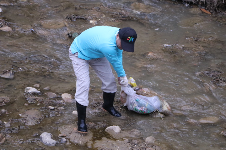 | 環保隊志工翻越圍欄至溪流中撿拾垃圾袋