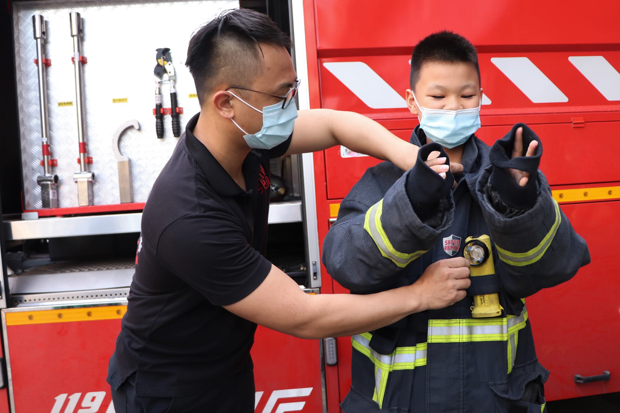 最後一關為消防衣著裝體驗,透過穿戴消防衣帽鞋,讓學生體驗化身「打火兄弟」的滋味。由泰山分隊隊員呂信賢進行示範,防護裝備包含消防衣、帽、鞋及空呼器,但重量也不輕,整套裝備約為二十至三十公斤。藉由防災教育,結合學校課程,裕民分隊宣導承辦人李建南表示,利用做中學的實作方式,將防災觀念深植於國小學童心中。
