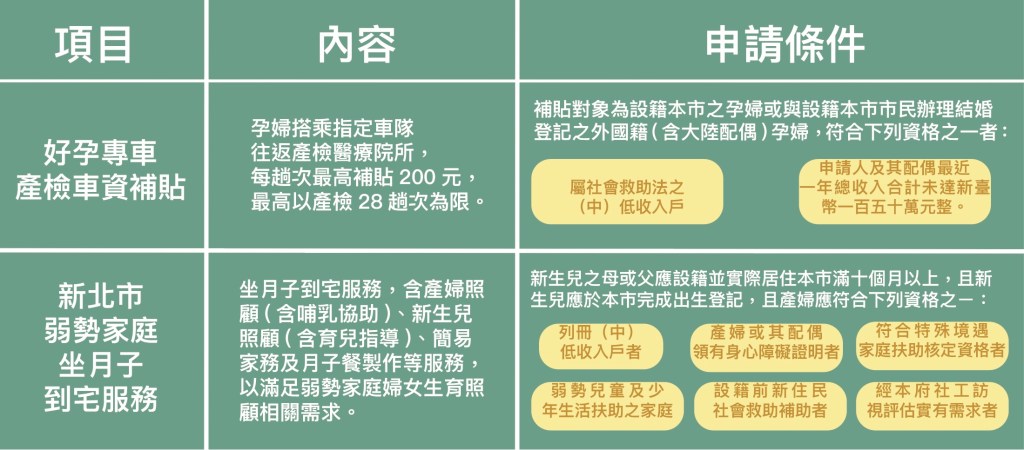 中央和地方政府為了提升各地生育率,提供各項生育補助和福利。目前全國兩歲以下孩童皆可領取育兒津貼,但一般家庭和中低、低收入戶家庭享不同補助金額,今年八月後將以胎數而非家庭狀況為依據,第一胎每月補助五千元,三胎以上則是每月七千元。新北市政府也提供好孕專車產檢車資補貼,只要符合申請資格,孕婦搭乘指定車隊往返產檢醫療院所,每趟次最多可補貼兩百元,最高以產檢二十八趟次為限。另外有新北市弱勢家庭坐月子到宅服務也一樣符合設定條件,申請後可享共一百二十小時的坐月子到宅服務,含產婦照顧、新生兒照顧、簡易家務及月子餐製作等服務。