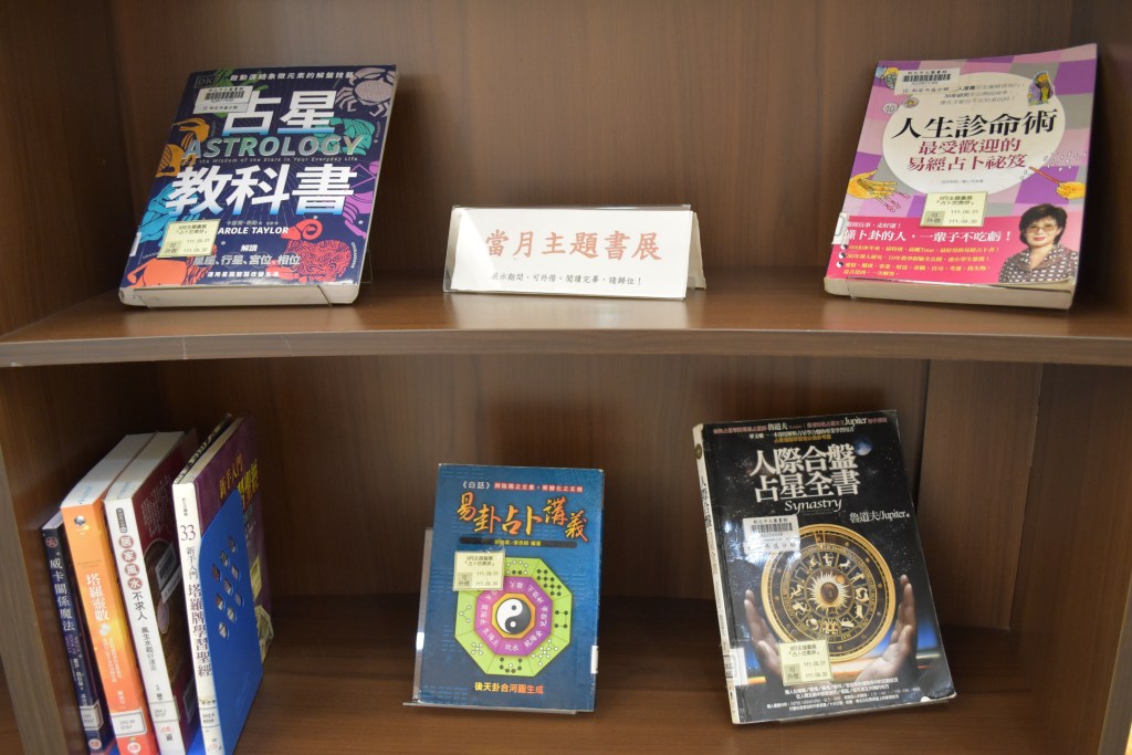 【記者林昱萱報導】九月一日至三十日,西盛分館在二樓展區策劃主題書展《占卜的奧妙》,提供占卜、占星、命理等書籍,比如《占卜教科書》、《人生診命術》、《手指占卜》等等。