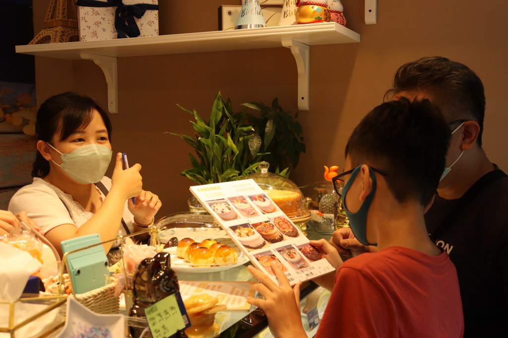 鄭小姐與客人介紹店內蛋糕。攝影/張乃宣
