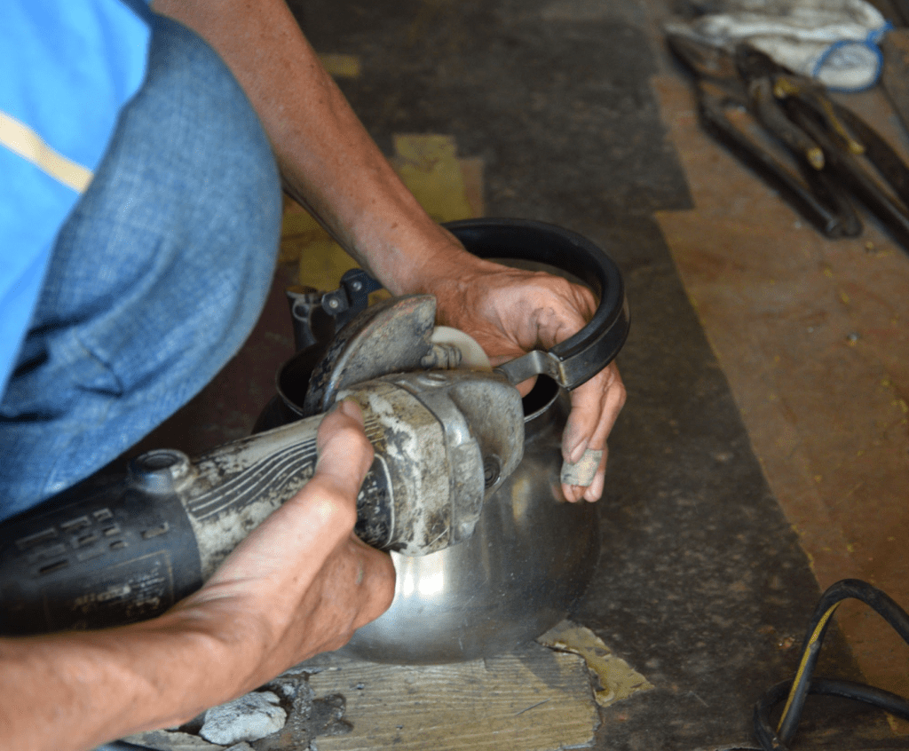 老闆娘李太太分享,近十年來工活愈做愈少,純手工被機械取代。像白鐵手工活的燈管製造,早期流程的第一步是先畫出燈管的完成圖,接著打版,使用尺規工具拆解設計圖,把立體圖轉換成平面展開圖。再來裁剪鐵皮,最後利用焊接或折邊手法把材料固定起來。現代工廠則用電腦繪製設計圖,操作高級壓床機把模型範本壓出後,即可大量製造。