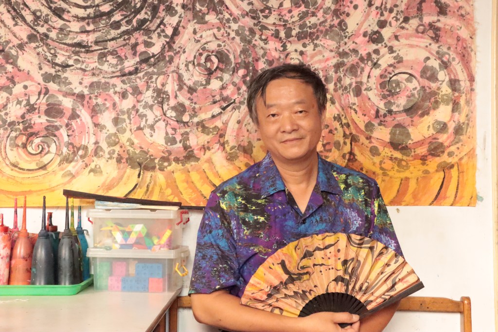 【記者沈郁芯報導】二十多年前,從輔仁大學織品學系畢業的陳亮運,學習印染工藝已經有二十八年。在二〇〇五年,於新莊開設傑瑛浮染創作藝術坊,二〇一〇年,克服原先只能在紙上創作的限制,透過將浮染藝術融入日常用品製作的過程中,讓浮染更貼近民眾生活。