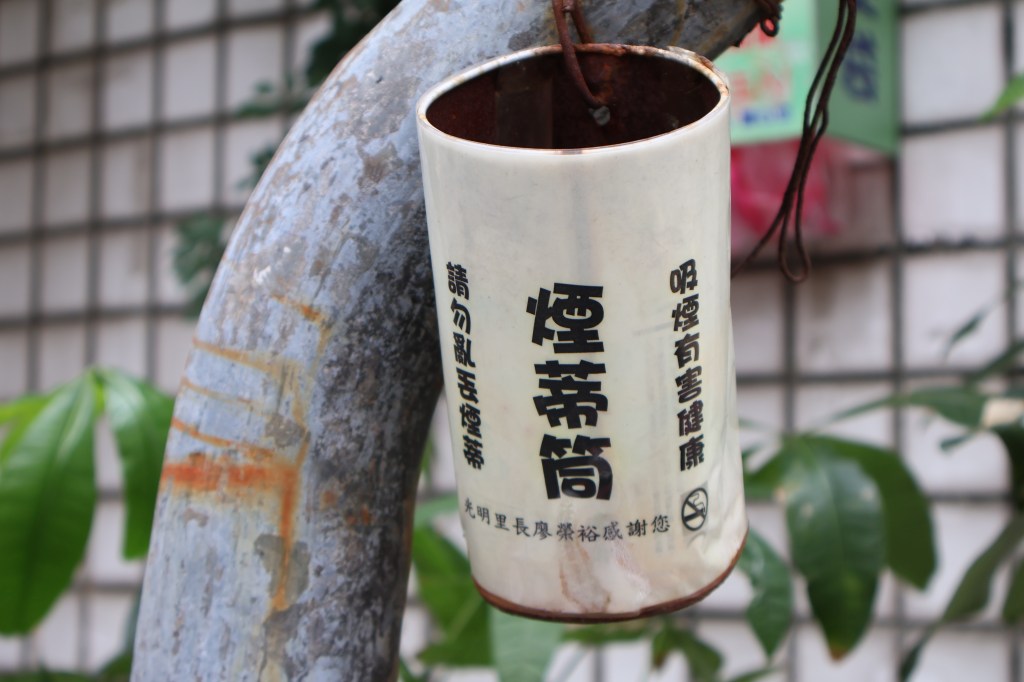 掛在光明里民安西路樹上的煙蒂筒。攝影/吳艾宣