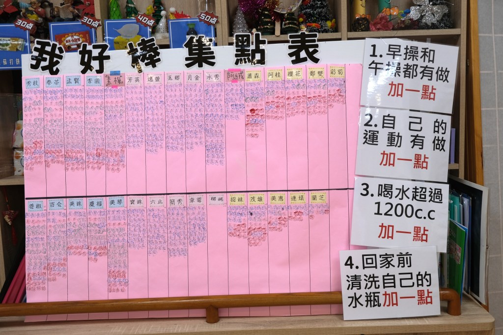 而今年八月會正式推行,是因為照服員們每天都要花很多時間幫長輩清洗水壺,照服員們討論後,為了鼓勵長輩們可以自己洗水壺,並增加他們生活自理的能力,加上剛好有一名善心人士林小姐提供了許多獎品,於是決定正式推行集點運動。