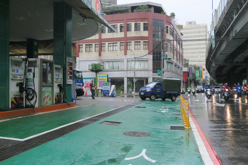 【記者黃達彥報導】位於新北大道及化成路路口轉角處的加油站,周遭包含出入口都劃設綠面標線型人行道。此設計恐怕會導致駕駛在進出加油站時感到困惑,此外若車輛停留在人行道上更可能導致駕駛受罰。