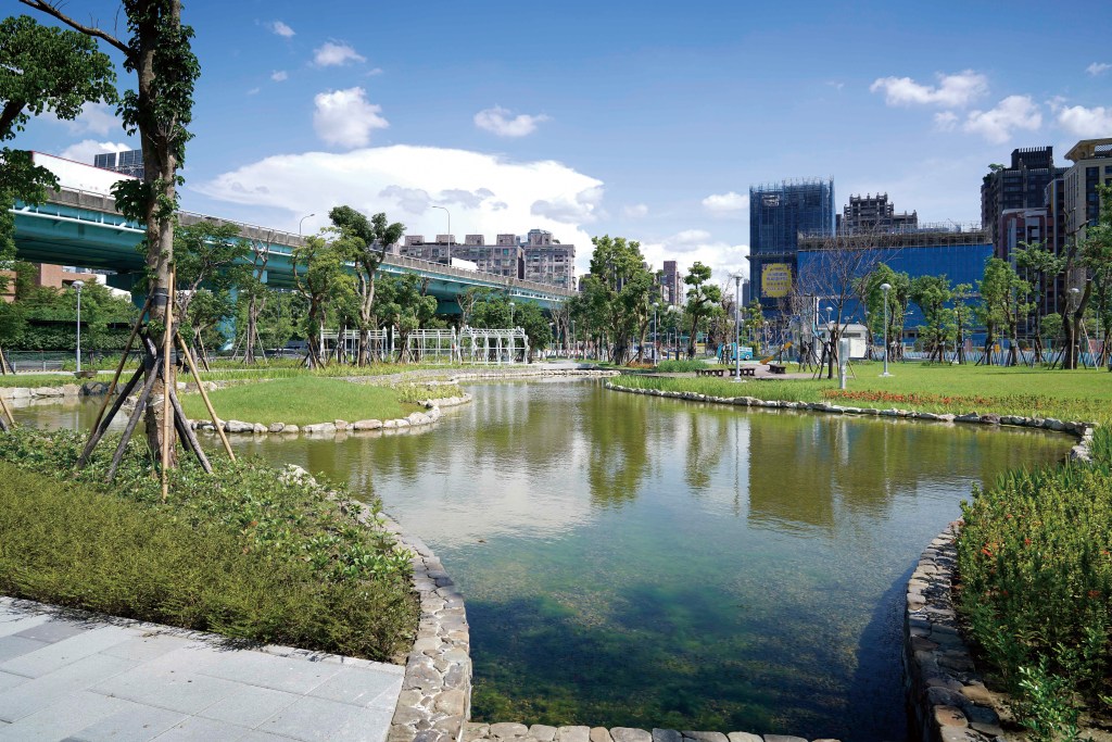 張季水說,中環公園地勢低窪,過去在雨季時易淹水,例如民國一〇四年蘇迪勒颱風導致三泰路、中環路與新生路一帶地段嚴重積水。因此地政局考量原有地形條件,在公園內設置生態池,兼具景觀與滯洪功能。